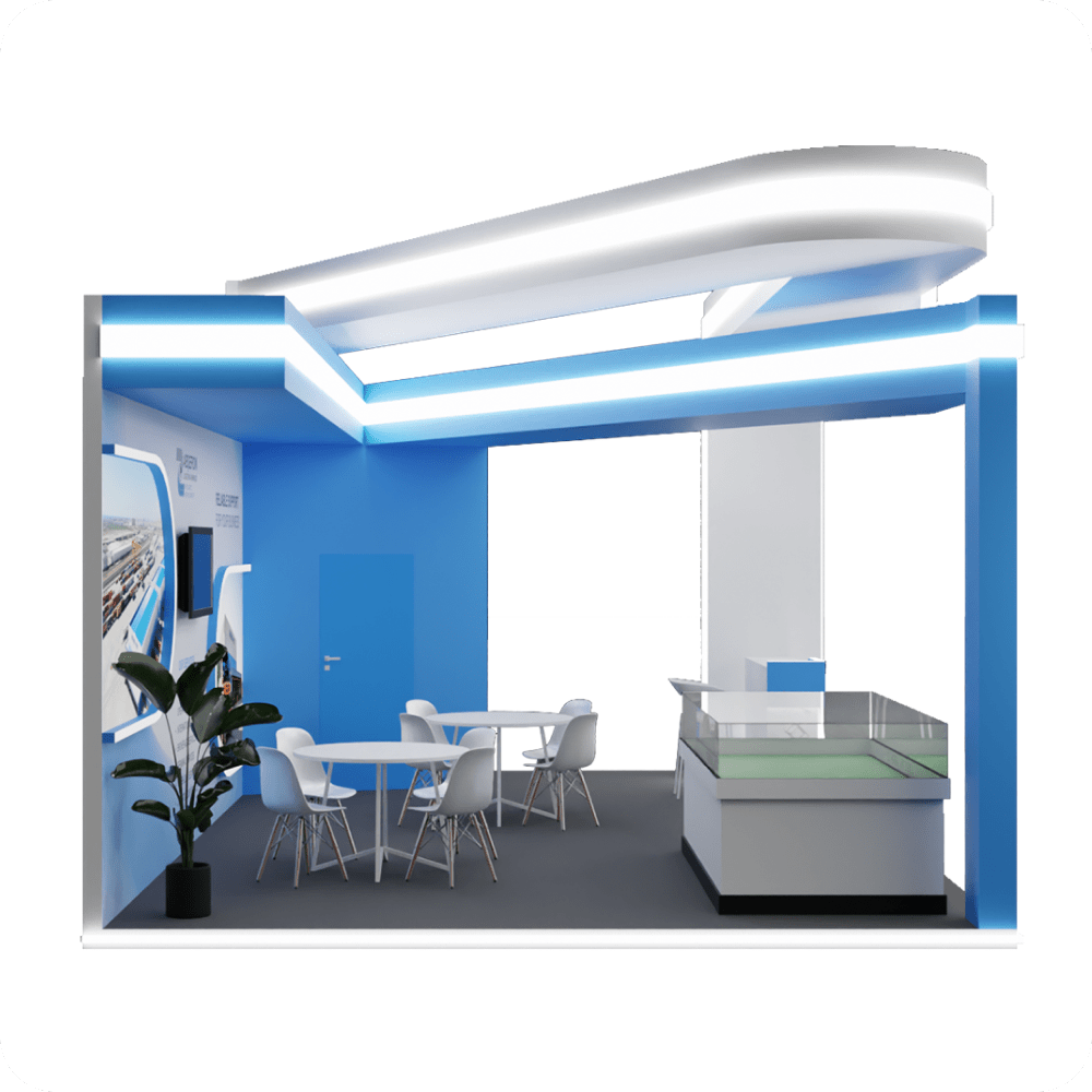 Abşeron Logistika Mərkəzi üçün hazırlanmış bu 40 m²-lik sərgi stendi müasir və texnoloji yanaşma ilə dizayn edilib. Stand ziyarətçilərə şirkətin təqdim etdiyi logistik xidmətləri tanıtmaq üçün geniş informasiya sahələri, görüş zonaları və maket təqdimatları ilə təchiz olunub. Mavi və ağ rəng palitrası etibar və texnologiyanı simvolizə edir.
