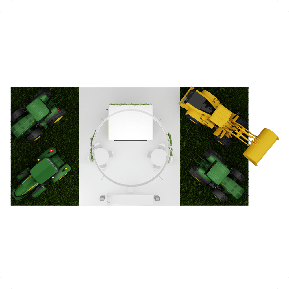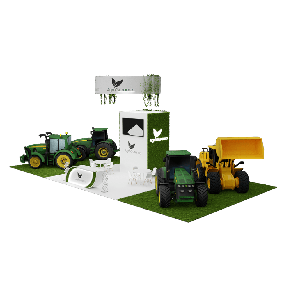 This 128 m² exhibition stand for AgroGurama is designed to showcase agricultural machinery and technological solutions. The open-layout concept allows for a strong visual presence with real machinery display. With green textures and natural inspiration, the stand highlights innovation and eco-conscious design. A central branding tower, guest seating areas, and product zones create an immersive experience.