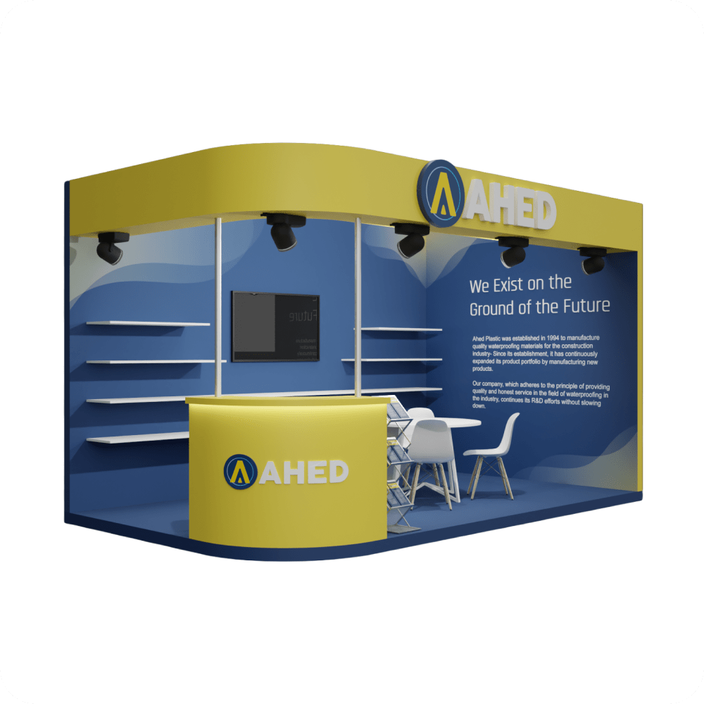 This 15 m² exhibition booth designed for AHED offers a professional yet compact display space. The bold combination of yellow and blue enhances brand visibility while keeping the environment welcoming. It includes distinct areas for guest seating, product showcasing, and branded communication. The front desk welcomes visitors and reinforces AHED’s identity. Wall-mounted texts and visual materials provide clear insights into the company’s mission and expertise.