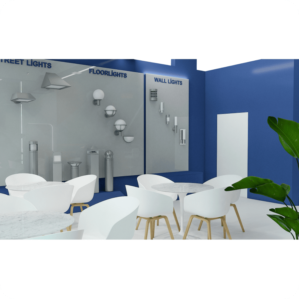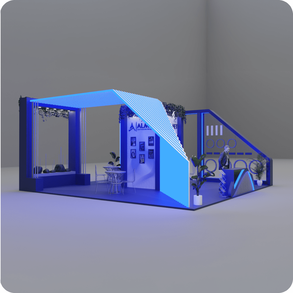 This 64 m² exhibition booth designed for ALMET showcases an open, welcoming, and modern concept. With deep blue tones, structured lighting, greenery, and branding elements, the stand highlights the company’s innovative approach and corporate strength. The circular hanging sign and product showcase areas create an immersive space for visitor engagement and professional meetings.
