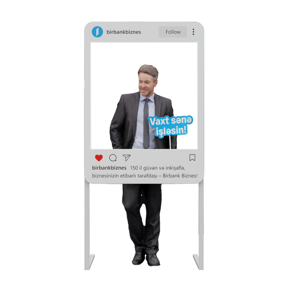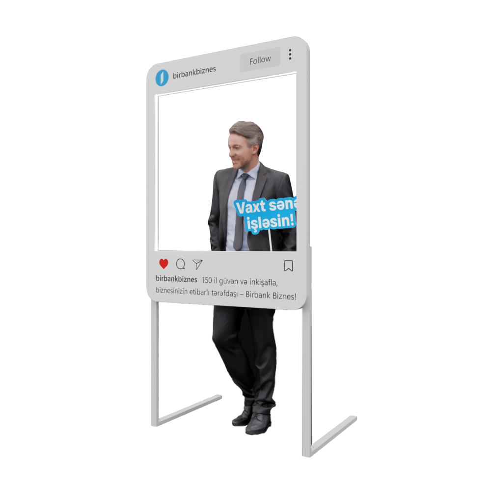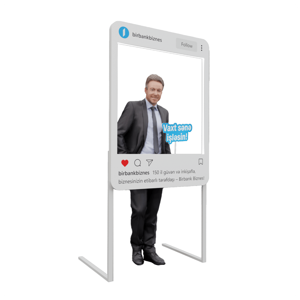 Birbank Biznes üçün hazırlanan bu fotozona sosial media formatında innovativ həll təklif edir. İnstagram çərçivəsini xatırladan konstruksiya brend mesajını – “Vaxt sənə işləsin!” – ön plana çıxarır. Sadə və funksional quruluşu ilə tədbirlər, sərgilər və promo aksiyalar üçün ideal seçimdir. Fotozona sosial şəbəkələrdə paylaşım üçün xüsusi nəzərdə tutulub və brendin tanınmasına əlavə dəyər qatır.