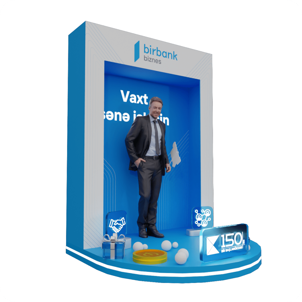 This Birbank Business photo zone showcases the brand’s key messages “Let time work for you!” and “150 years – a new beginning” in a clean, modern style. The combination of depth, lighting, and geometry creates a professional and engaging atmosphere for events and exhibitions. Perfect for photos, videos, and social media sharing.