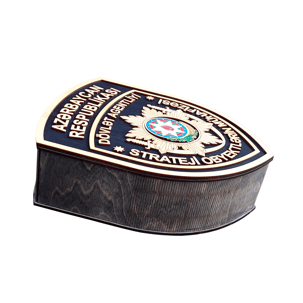 The box features the agency’s emblem in a layered wooden design with precision laser cutting and color detailing.
