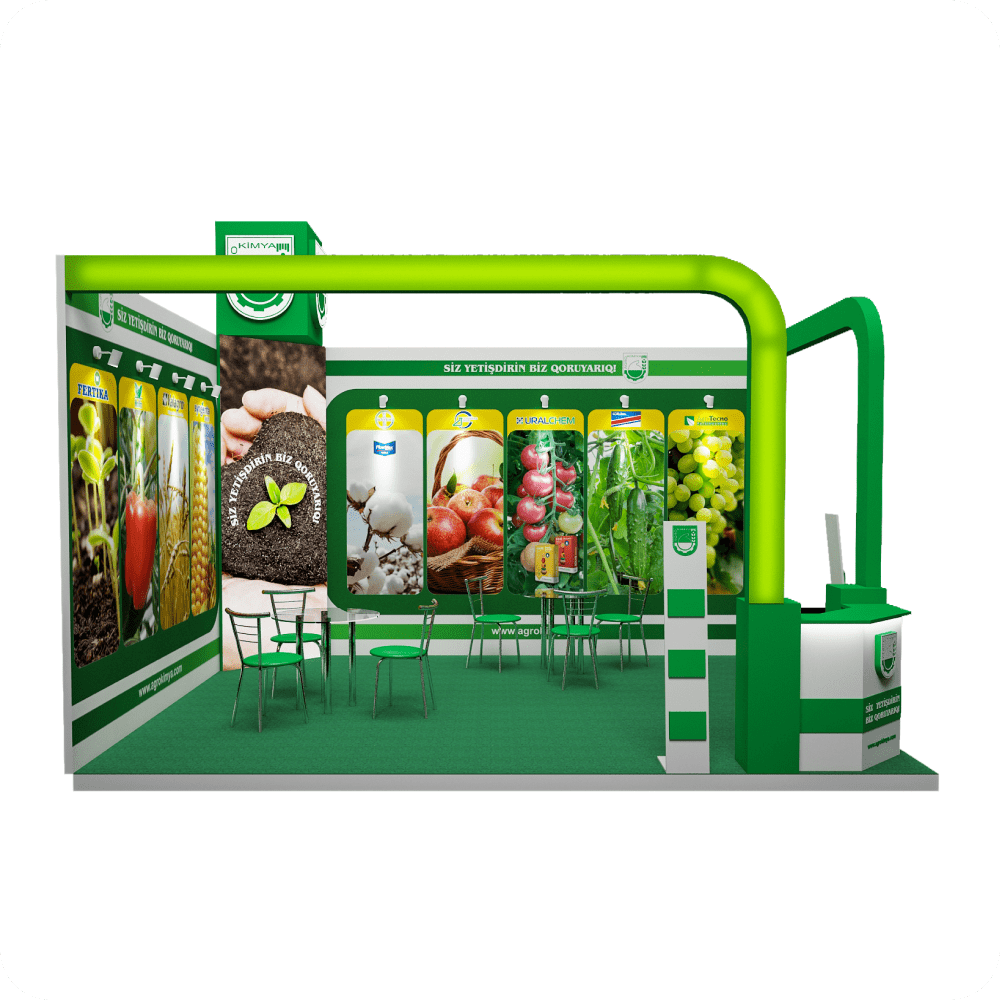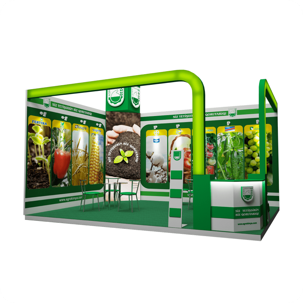 Şəkildə gördüyünüz 16 m²-lik Aqrokimya sərgi stendi kənd təsərrüfatı sahəsində fəaliyyət göstərən brend üçün xüsusi dizayn edilmişdir. Yaşıl tonlarda fərdi dizayn, məhsul vizualları, brend loqotipləri və LED işıqlandırma ilə təchiz olunmuşdur. Kiçik sahəyə baxmayaraq, təqdimat və ziyarətçi rahatlığı üçün tam funksional interyerə malikdir.