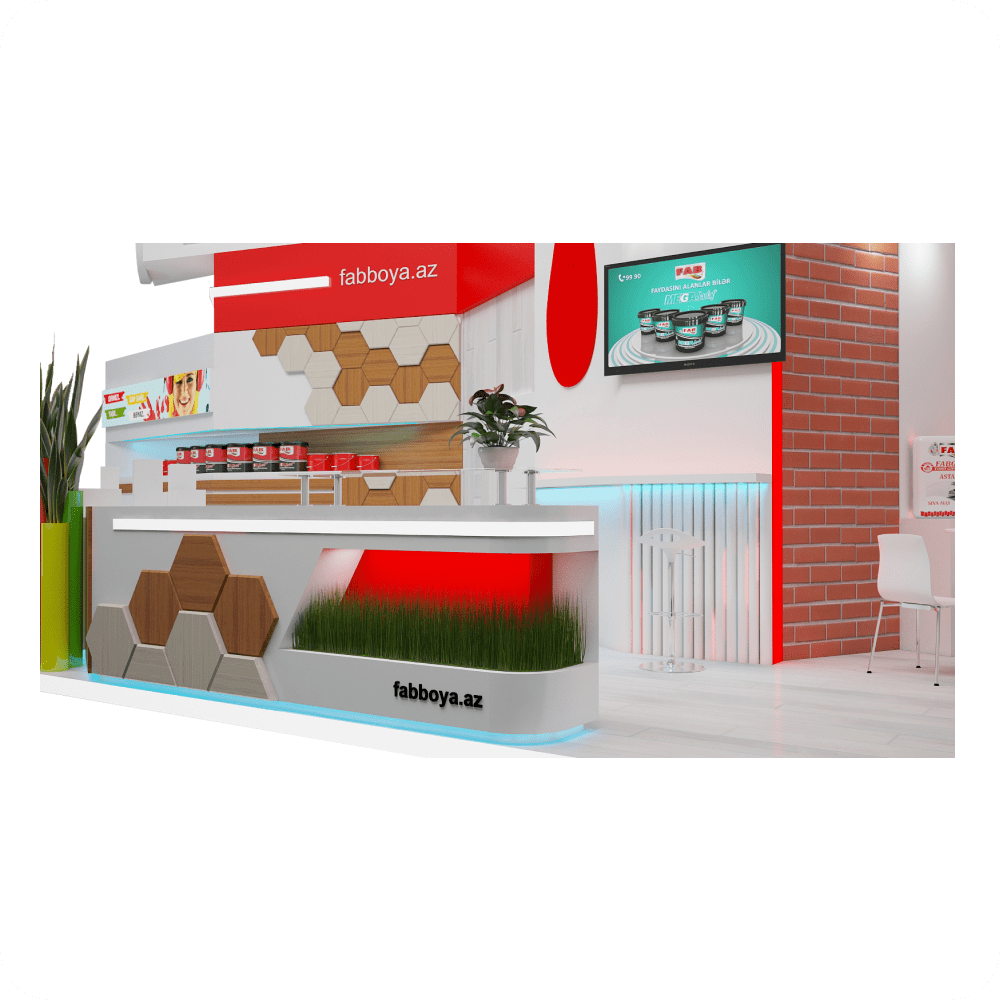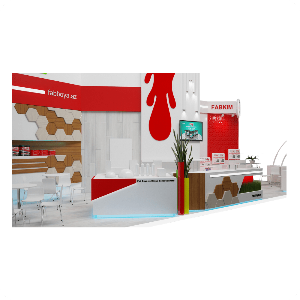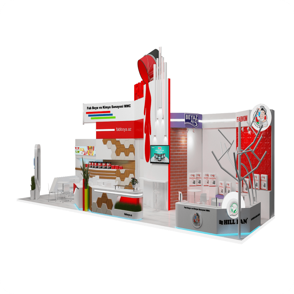 Fab Boya Sərgi Stendi – 24 m² sahəni əhatə edən, boya və kimya sənayesi üzrə fəaliyyət göstərən Fab Boya MMC üçün xüsusi olaraq dizayn edilmişdir. Stendin ön hissəsində nəhəng boya damcıları effekti verən qırmızı element, modern hissələr, şaquli quraşdırmalar və LED monitorlar yer alır. İnteraktiv təqdimat zonaları, açıq oturma sahəsi və məhsul vitrinləri ilə sərgidə maksimum vizual təsir yaradır.