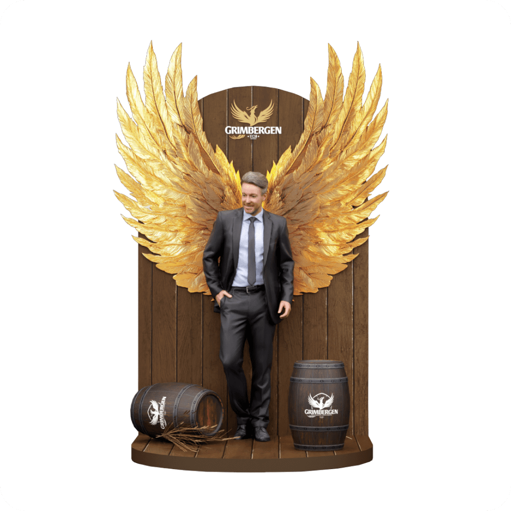 Фотозона Grimbergen создаёт уникальную атмосферу и предлагает посетителям яркий фотоконтент. Золотые крылья в сочетании с деревянным фоном и брендированными бочонками подчёркивают стиль бренда. Такая зона идеально подходит для фото и публикаций в соцсетях, усиливая эмоциональную связь с брендом.