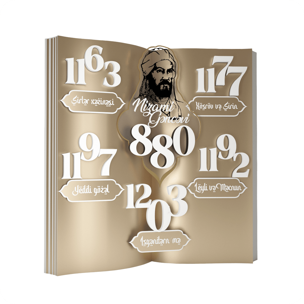 Фотозона, посвящённая великому азербайджанскому поэту и мыслителю Низами Гянджеви, выполнена в форме раскрытой книги. На ней представлены основные даты и произведения поэта. Золотые и белые тона создают атмосферу торжественности и утончённости. Подходит для культурных мероприятий, музеев и литературных выставок.
