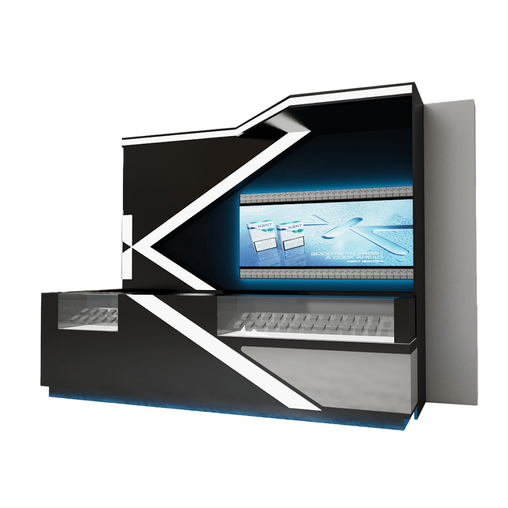 Kent brendi üçün hazırlanmış promo və satış stendi müasir üslubda dizayn olunub və məhsulların effektiv təqdimatına xidmət edir. Qara və ağ rənglərin kontrastı, LED işıq effektləri və iri TV panel brendin peşəkar imicini gücləndirir. Şüşə vitrinlərdə məhsullar aydın görünür, ekran isə multimedia təqdimatları üçün imkan yaradır. Kompakt ölçülü bu stend satış nöqtələrində və sərgilərdə maksimum təsir üçün nəzərdə tutulub.