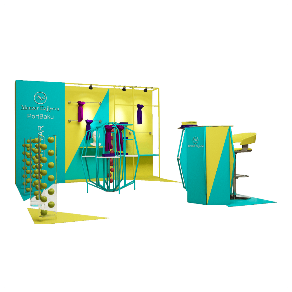 This Menzer Hajiyeva promo and sales stand is designed to highlight the brand’s elegance and creativity. With a bright yellow and turquoise color scheme, it delivers a lively and modern appearance. The stand features unique display units for accessories, a reception counter, and decorative structures that strengthen brand recognition. Ideal for exhibitions and shopping malls, this setup ensures high visual impact and customer engagement.
