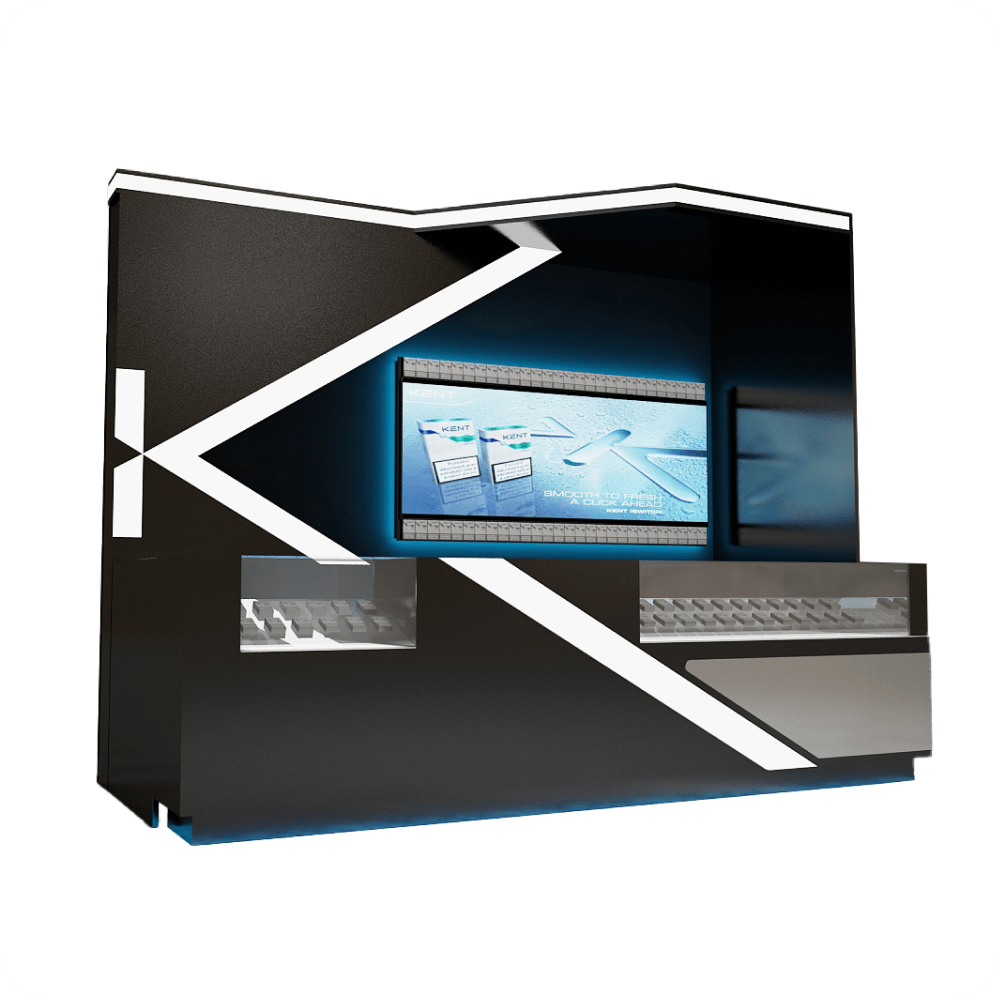 Промо и торговый стенд Kent выполнен в современном стиле и создан для эффективной презентации продукции. Контраст чёрного и белого цветов в сочетании с LED-подсветкой усиливают бренд-имидж. Стеклянные витрины позволяют наглядно демонстрировать товары, а большой экран обеспечивает мультимедийное сопровождение. Компактная форма делает стенд удобным для выставок и торговых площадок.