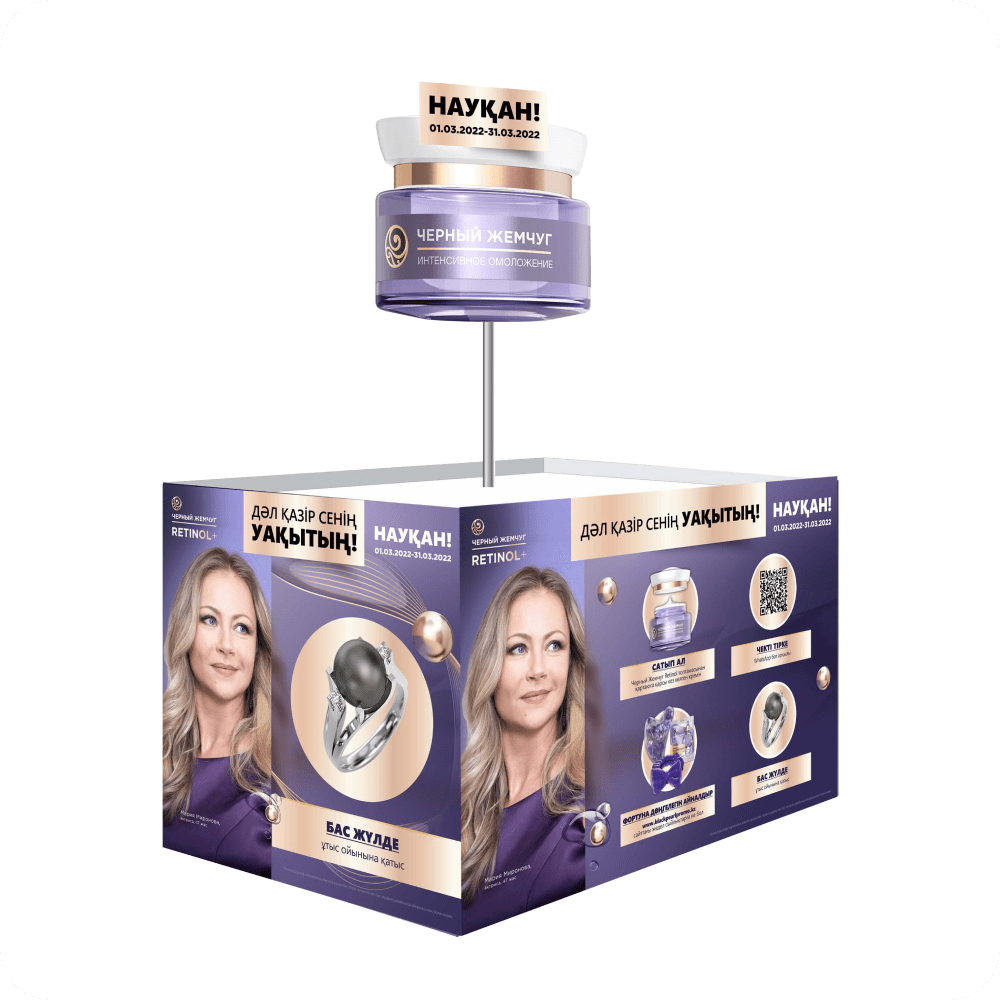 Промо-стенд Black Pearl создан для привлечения внимания покупателей и эффективного продвижения бренда в торговых точках. Дизайн в фирменных цветах подчеркивает премиальный характер продукта, а 3D-модель баночки с кремом делает конструкцию заметной издалека. Идеально подходит для акций, презентаций и промо-мероприятий в магазинах.