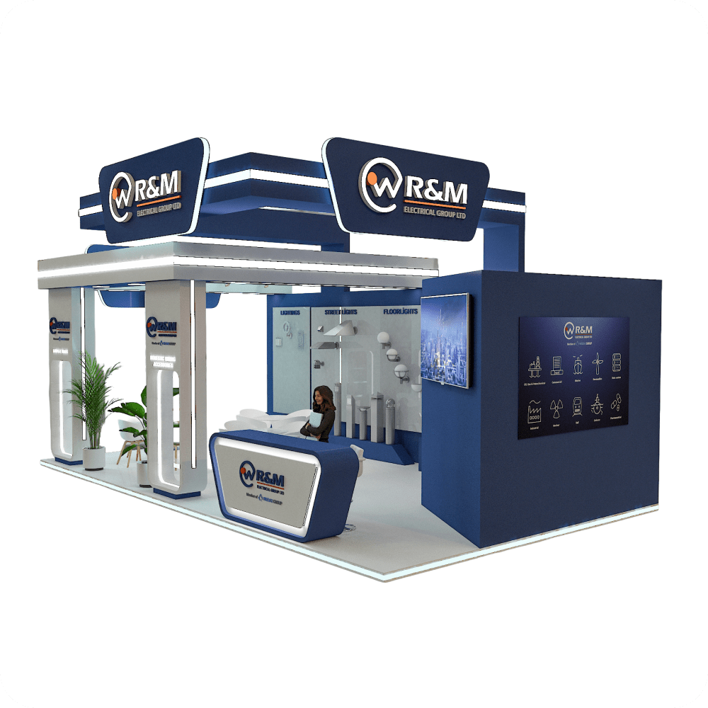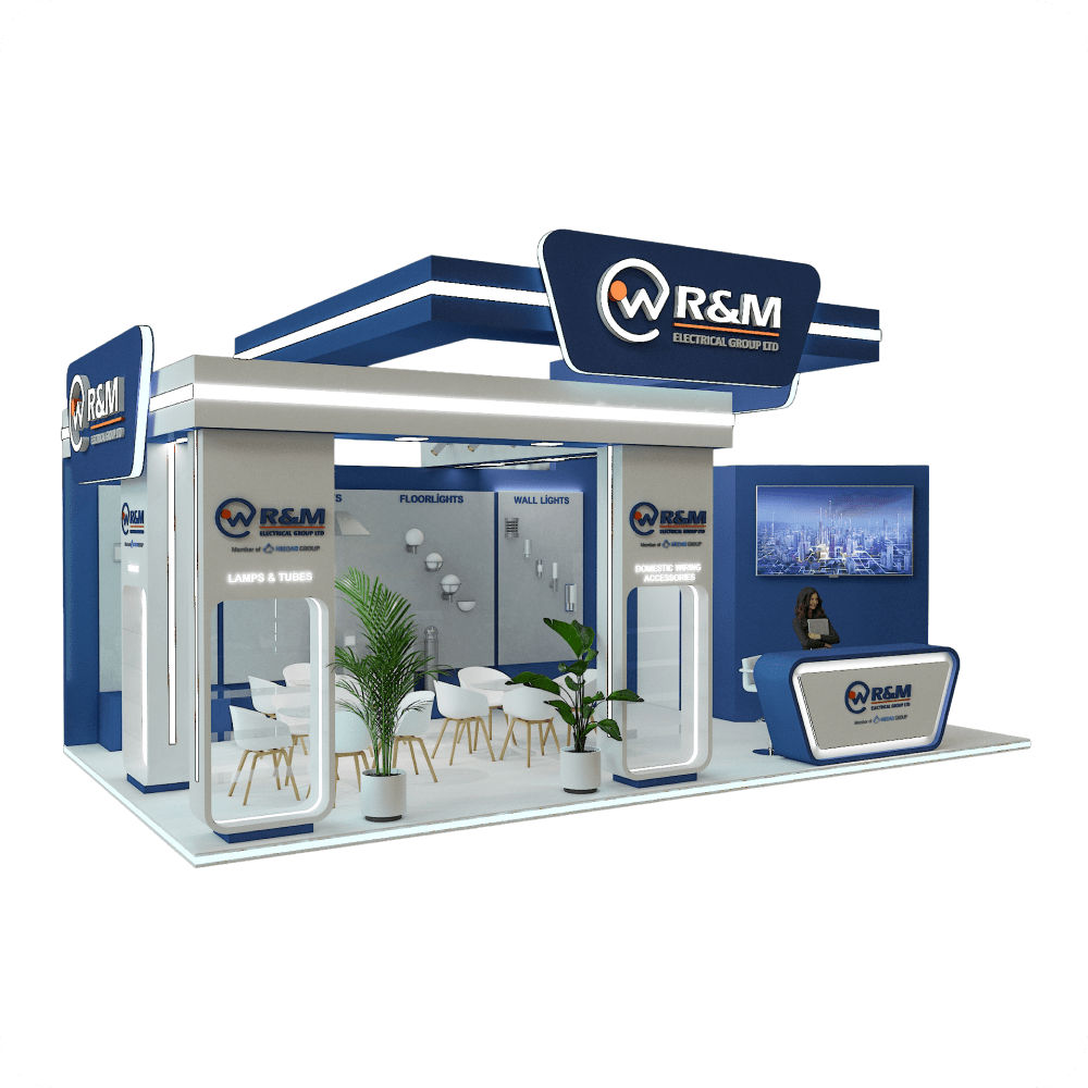 This 35 m² exhibition stand, designed for R&M Electrical Group Ltd, offers a modern and structured layout ideal for showcasing technical lighting products. Dedicated zones for “Street Lights”, “Floor Lights”, and “Wall Lights” clearly display product categories. The central seating area supports visitor engagement, while a branded welcome desk and digital display elevate the company’s professional presence. The navy and white color palette, combined with lighting effects, gives the booth a sleek and innovative appearance.