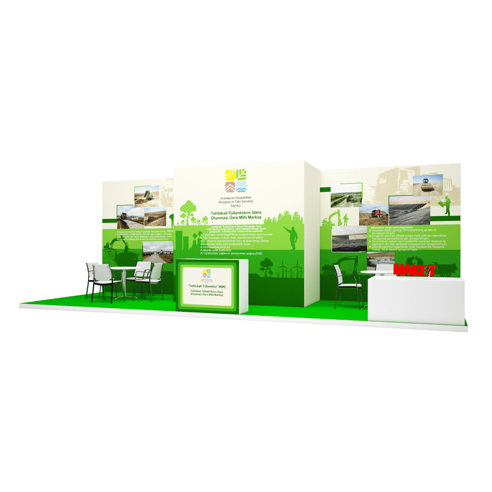 The 21 m² exhibition booth for Təhlükəli Tullantılar MMC presents the company’s eco-conscious approach and technical expertise in hazardous waste management. The green-white theme reflects environmental responsibility, while the booth offers areas for guest interaction, model display, and informative branding.