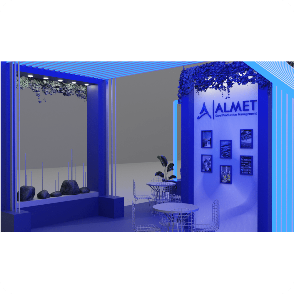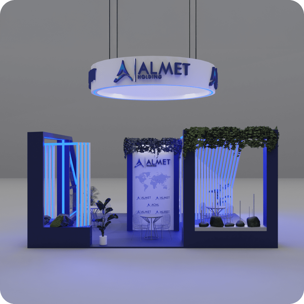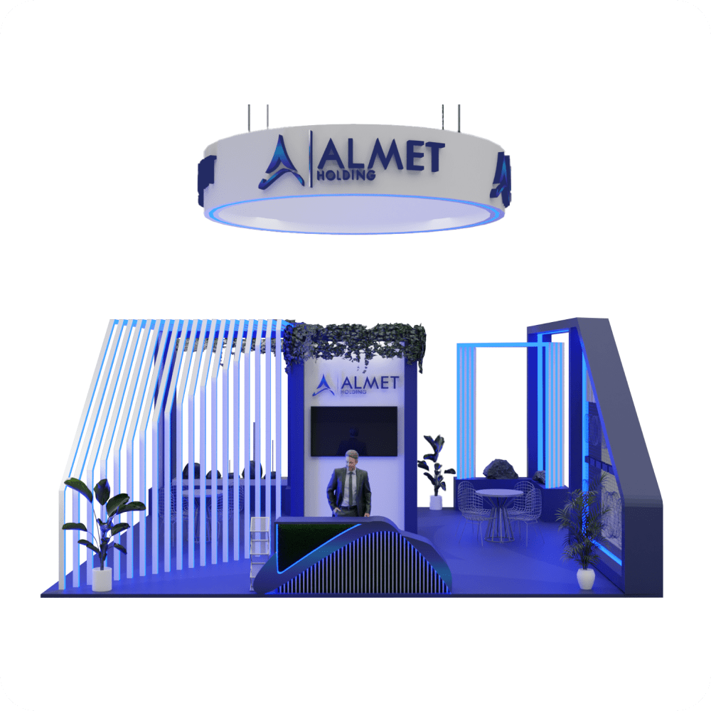 This 64 m² exhibition booth designed for ALMET showcases an open, welcoming, and modern concept. With deep blue tones, structured lighting, greenery, and branding elements, the stand highlights the company’s innovative approach and corporate strength. The circular hanging sign and product showcase areas create an immersive space for visitor engagement and professional meetings.