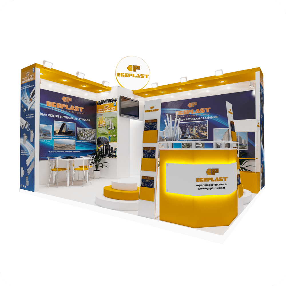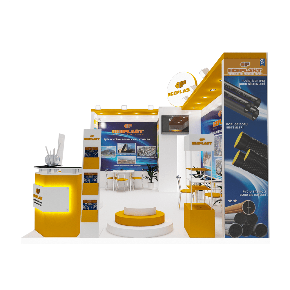 Выставочный стенд Egeplast площадью 16 м² предназначен для представления инженерных и инфраструктурных трубных решений. Яркие цвета (жёлтый и синий), логотипы, освещение и демонстрационные элементы делают стенд компактным, но заметным. Подходит для трубных систем из PVC и PE.