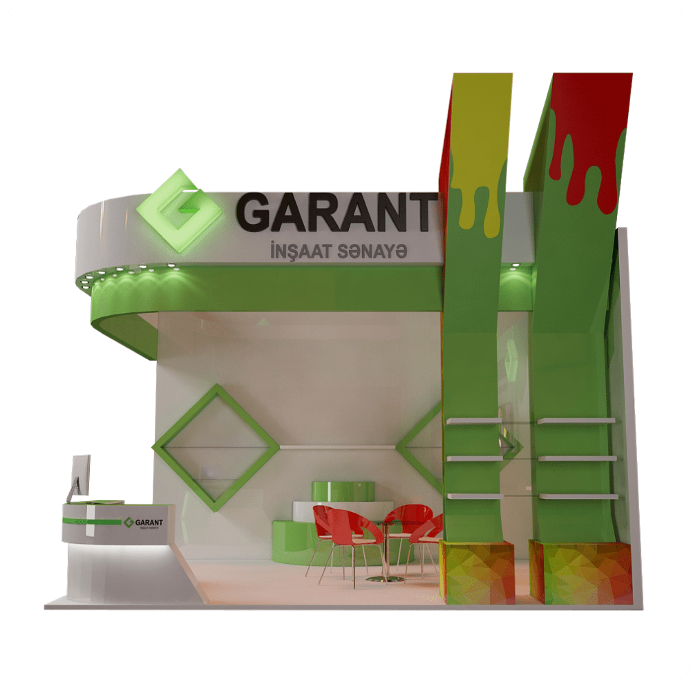 Выставочный стенд Garant İnşaat Sənaye площадью 12 м² разработан для компании, работающей в строительной и промышленной сфере. Яркий дизайн с зелёными, красными и оранжевыми оттенками, уникальные формы, подсвеченные логотипы и функциональные зоны делают стенд запоминающимся и стильным.