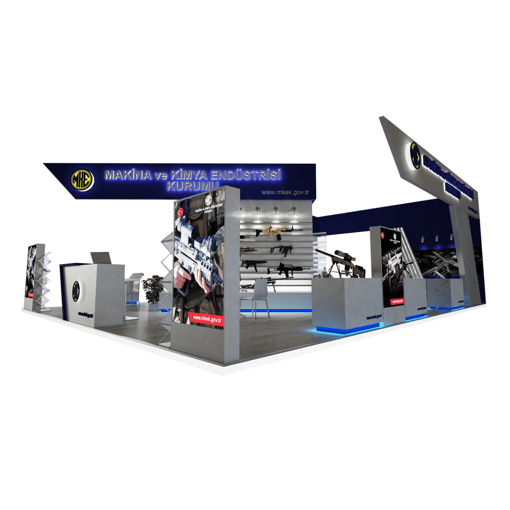 Выставочный стенд Машиностроительной и Химической Промышленности площадью 64 м² предназначен для демонстрации оружейной и оборонной продукции. Современный дизайн с металлическими оттенками, вертикальными стендами с оружием, LED-подсветкой, мониторами и зоной переговоров создаёт профессиональную и стильную атмосферу.